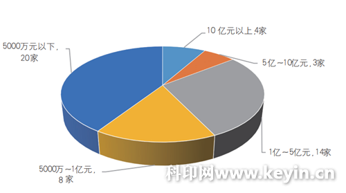 如圖4,49家企業(yè)中,對(duì)外加工貿(mào)易額超過(guò)10億元人民幣的企業(yè)有4家,與上屆榜單一樣,分別為深圳市裕同包裝科技股份有限公司、廈門(mén)吉宏科技股份有限公司、鶴山雅圖仕印刷有限公司、鴻興印刷集團(tuán)有限公司;出口額處于1億~10億元人民幣的企業(yè)有17家,比上屆榜單多了3家,其中云南恩捷新材料股份有限公司、美盈森集團(tuán)股份有限公司、廈門(mén)保灃實(shí)業(yè)有限公司3家企業(yè)的對(duì)外加工貿(mào)易額均達(dá)到9億元人民幣。